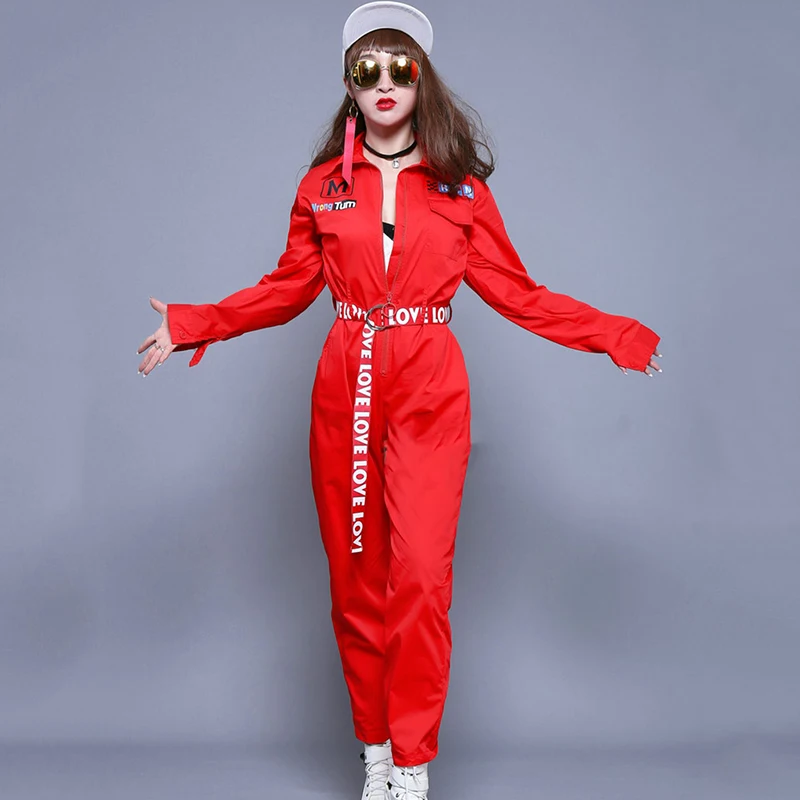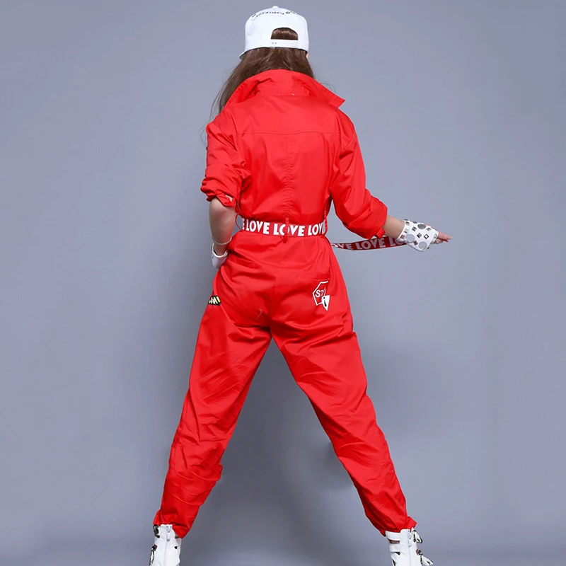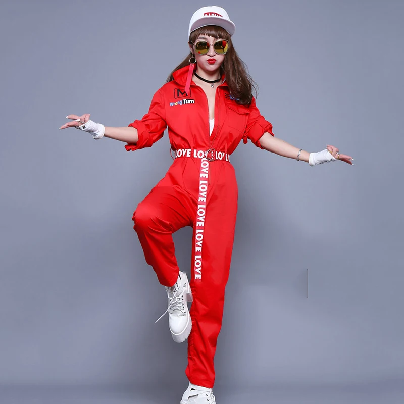 Super Deal Jazz Dance Costumes Adult Red Long Sleeve Tooling Jumpsuit Hip Hop Clothing Street Dancewear Women